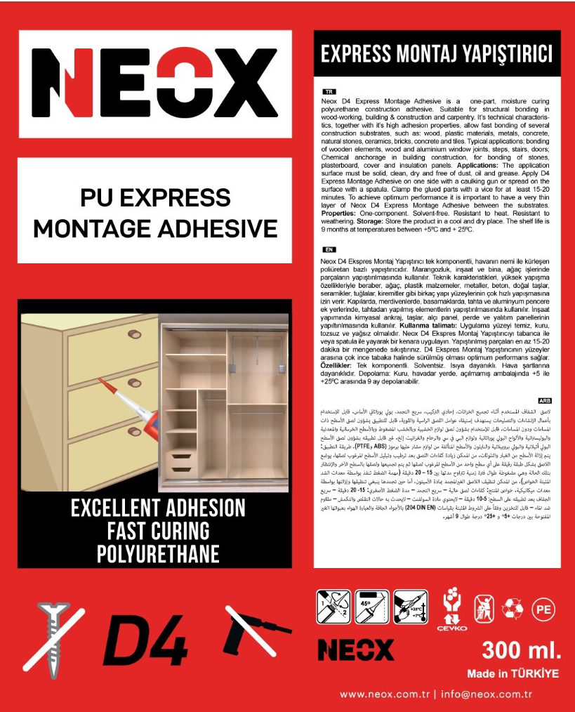NEOX ve NEXFIX markaları, Antalya'da bulunan fabrikamızda üretilmektedir. Üstün kalite standartlarında üretilen Duşkabin silikonu, Dış cephe silikonu, Poliüretan mastik, MS polimer, Silikon mastik, Akrilik mastik, Butylen mastik, Yangına dayanıklı ürünler ve Yapışkan Bant sistemleri birçok ülkeye ihracat edilmektedir.